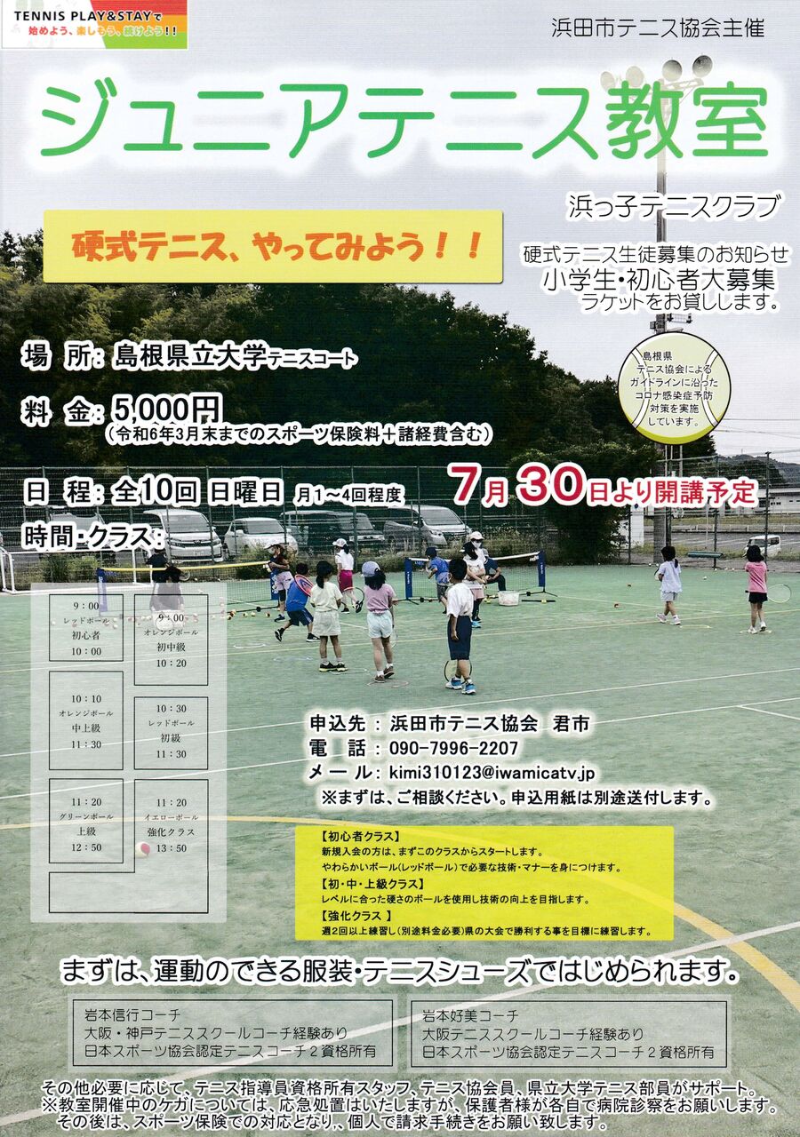2023年07月10日 浜っ子テニス教室が始まります 浜っ子ジュニアテニス教室(中期)が、7/30(日)から島根県立大学テニスコートで始まります。申込受付中です。途中からでも参加できます。体験レッスンもOKです。参加するときは、下記の掲示板をご確認ください。浜っ子テニスクラブ掲示板浜っ子テニス教室のパンフレットです。